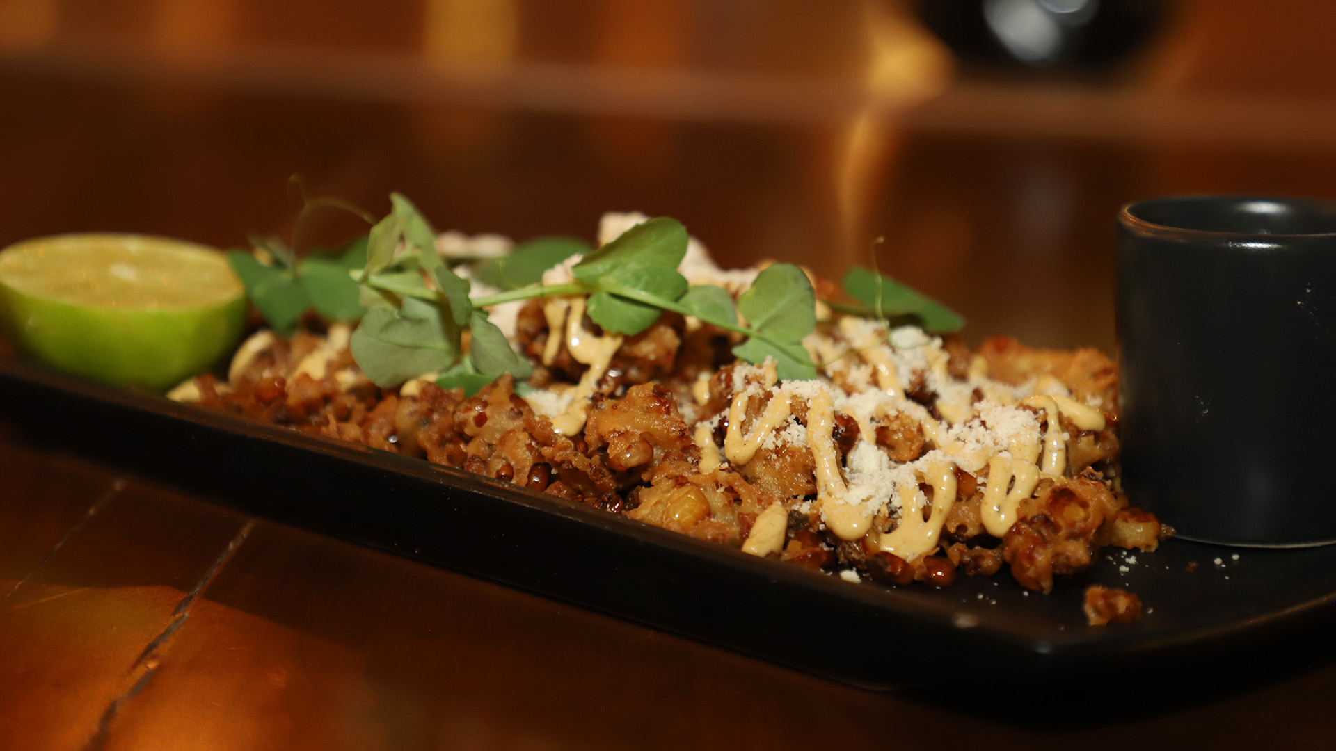 - Tempura con mayonesa de chiles toreados, queso parmesano y tajín